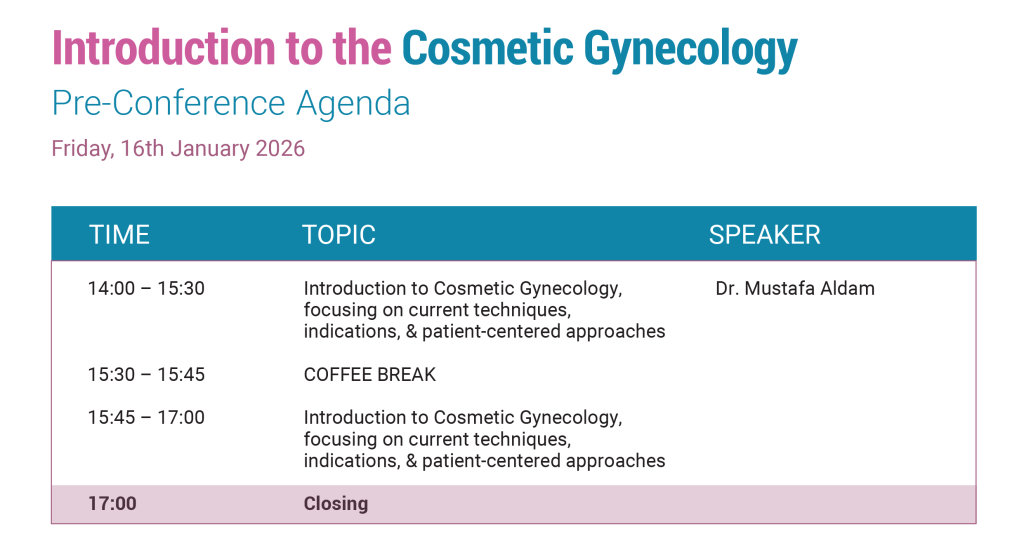 This workshop provides an introduction to cosmetic gynecology, focusing on current techniques, indications, and patient-centered approaches. Participants will gain practical insights into assessment, procedural options, and postoperative care, with emphasis on safety, ethics, and improving patient outcomes.